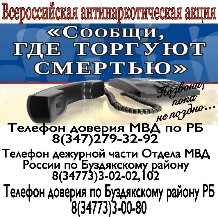 В период с 15 по 26 марта 2021 года на территории муниципального района Буздякский район Республики Башкортостан проводится I этап акции «Сообщи, где торгуют смертью», целями которой является привлечение внимание общественности к противодействию незаконному обороту наркотиков, предупреждение распространения наркомании среди несовершеннолетних, выявление фактов их вовлечения в преступную деятельность, связанную с незаконным оборотом наркотиков.